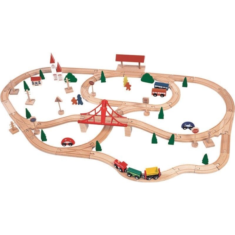 Zestaw do zabawy w kolejkę składający się z 90 elementów. Zawiera elementy kolejowe takie jak tory, wiadukty, pociąg oraz samochody, znaki drogowe i drzewa.