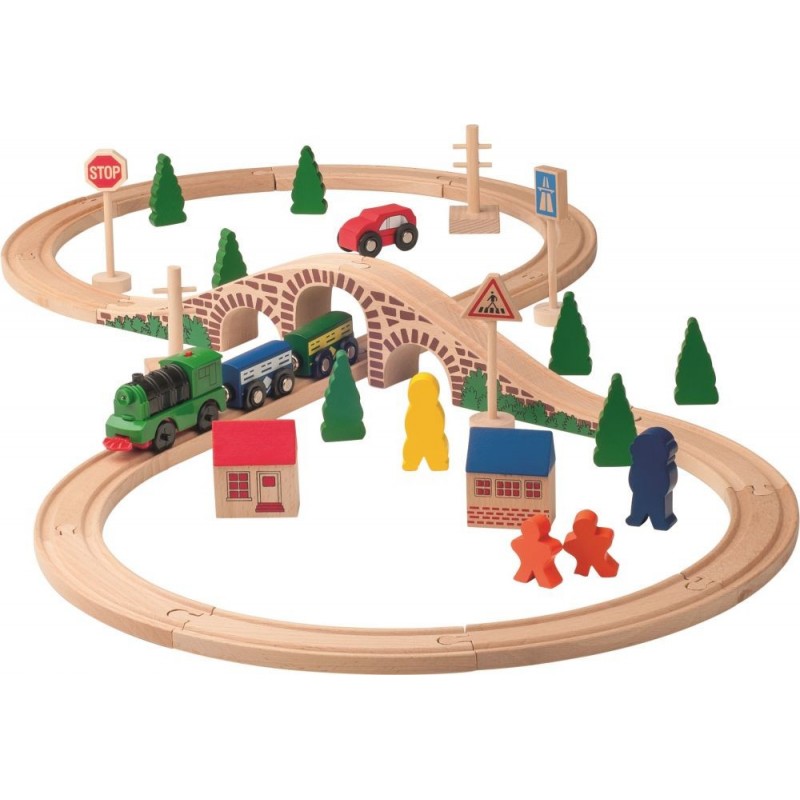 Większość elementów jest wykonana z drewna, jedynie lokomotywa z plastiku.